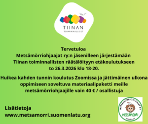 Tervetuloa Tiinan toiminnallisten Metsämörriohjaajat ry:lle räätälöityyn etäkoulutukseen to 26.3. klo 18–20! Ilmoittautumiset ti 24.3.2026 mennessä.